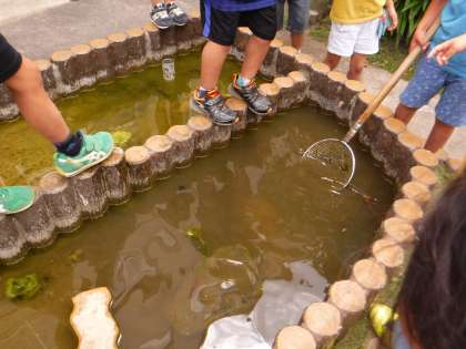 「先生,中庭の池に魚がいる!」と,今日は一日もちきりだったのですが,昼休みには網ですくって正体を確かめようとする子まで出だしました。「何の魚かな」「きっとマスやで!」と,瞳を輝かせながら言う子どもたちの好奇心を感じました。