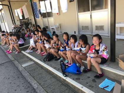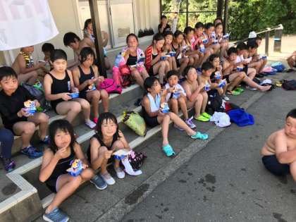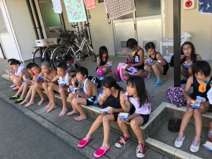 プールから上がってアイスクリームを食べています。甘くてシャキシャキしておいしいです。