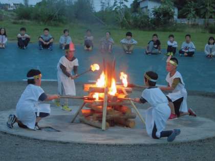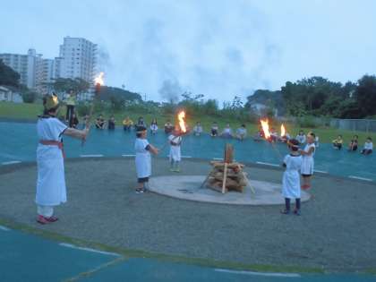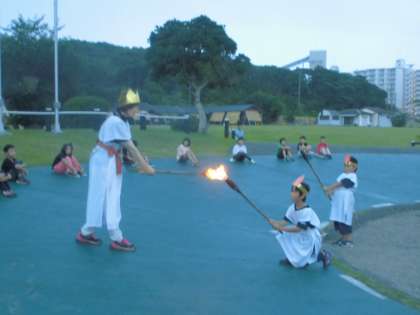 キャンプファイヤーのスタートは、火の神、火の神の子の入場です。「友情の火」「努力の火」「勇気の火」「感謝の火」の4つの火が点火されました。さあ、楽しいファイヤーの始まりです。