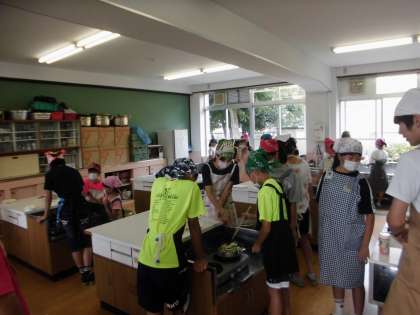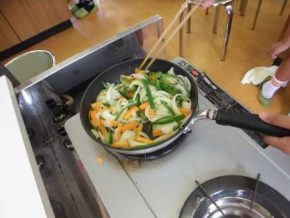 家庭科の調理実習を行いました。今回は,野菜炒めを作りました。食べやすい野菜の大きさ,油の量などを考えながら調理していました。