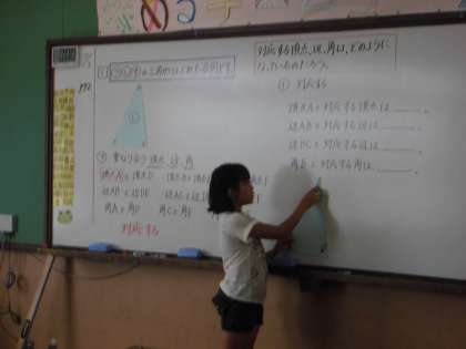 合同な図形で対応する頂点・辺・角について学習しました。それぞれ,対応する頂点・辺・角を見つける方法を学級で伝え合いました。