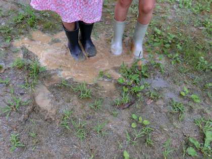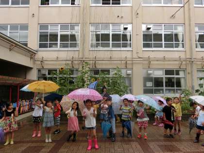 先日の雨が降った日に,校内で雨のときの様子を見るために探検をしました。草の葉には,水玉ができていたり,滑り台の様子などを見たりしました。晴れの日とちがうところをいっぱい見つけました。
