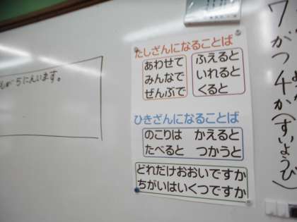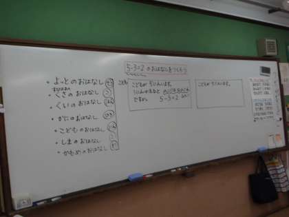 5−3の式となる問題を考えました。単位になることば「ひき,にん,ほん」など,話の場面によって変わることを学習しました。自分で,問題を式の意味から作ることができていました。
