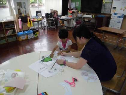 今日も2枚目のうちわづくりをしました。今回のは,葉と花の染出しをしたものを使って作りました。