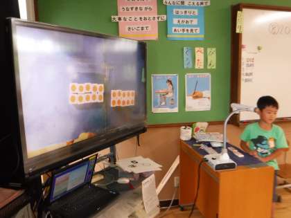 算数科では「20までのかず」の学習に入りました。これまでの10までの数でブロックを並べた経験を活かしながら,まずは「10といくつか」を考えながら具体物で理解しようとしています。カメラを使うと友達の考えもよく分かり,自分との違いなどを考えながら学習しています。