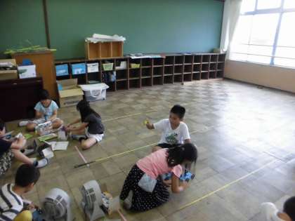 風の力と車の走る距離について調べました。風量を変えたときなど,一つの条件をそろえて,違いを比べました。