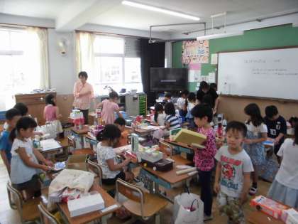 作品を作り始め,ボンドでつけたものが完成してきました。一人一人の想像の世界が広がる作品がいっぱいならんでいます。