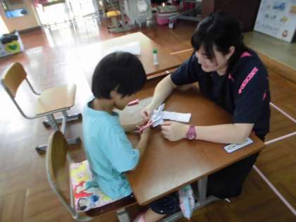 はさみの使い方を学習しています。紙をもつところとはさみできるところを確認しながら活動をしました。