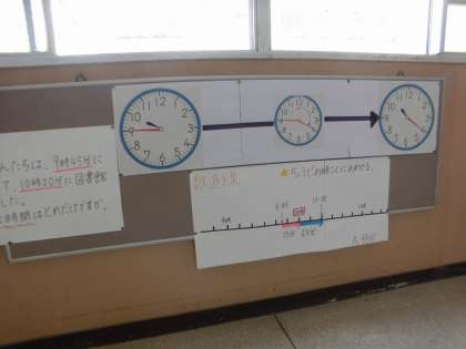 時刻と時間で学習したことが廊下に掲示されています。時刻と時間の違いは,子どもたちにとってもなかなか難しいです。