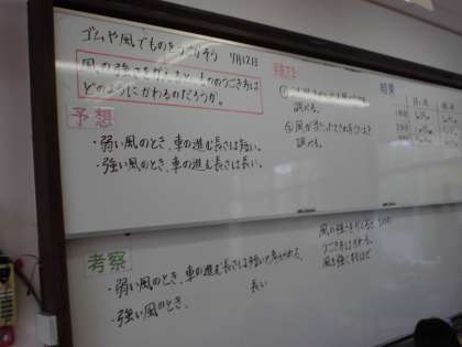 風の力で車を動かすときに,風の強さなどでどのように変わるのかをこれまでに実験してきたことをまとめる学習をしました。