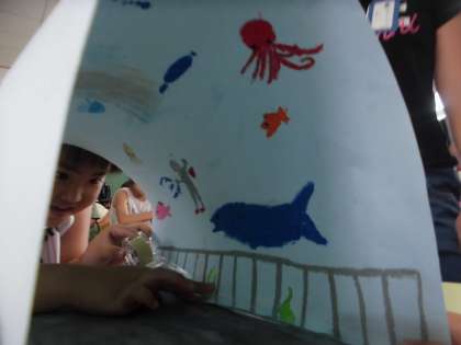 色がずいぶんとついて,組み立てて完成のイメージが作られ始めました。組立ながら,色を付け足したり,絵を付け足したりし,イメージをさらにふくらましながら作品を完成に近づけていました。