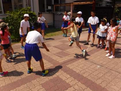 中間休みには5年生が大縄跳びのやり方を教えてくれました。「郵便屋さん」にのせて,一人一人飛び越えて行くというものです。どの子も1人ずつしっかりと飛び越そうと一生懸命です。