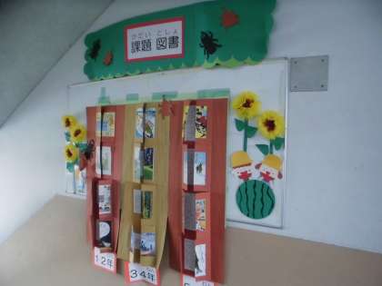 階段には,「課題図書」の木の掲示があります。それぞれの木には,低・中・高学年ごとに課題図書の内容が書かれています。