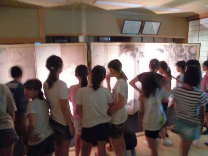 今日は,京都国立博物館から講師の先生をお招きして「文化財に親しむ授業」を行うことができました。雪舟の水墨画「四季花鳥図屏風」(重要文化財)のレプリカをもってきていただきました。絵の中に隠れている「鳥」の数,木の描き方など,興味深く教わることができました。この屏風は,春・夏・秋・冬の四季が描かれていること,松竹梅や鶴,オシドリなどが描かれていて,おめでたい祝いの席で飾られていたそうです。解説を聞き,絵の見方が変わりました。