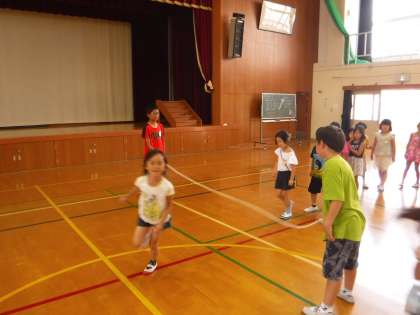 今日の中間休みには,1年生の大縄大会がありました。学級対抗で「郵便屋さん」の回数を競いました。なかなか白熱した勝負になりました。