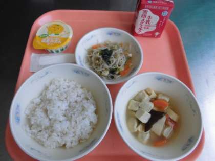 麦ごはん・牛乳・高野どうふと野菜のたき合わせ・もやしの煮びたし・みかんゼリー