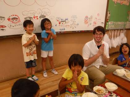 給食時間には,1学期で梅津北を離任される,ALTのマシュー先生が,最後の給食を食べに来てくれました。みんなウキウキでメッセージや質問を考えて伝えました。たった4か月ほどの付き合いでしたが,子どもたちはマシュー先生が大好きで,よく廊下でハイタッチをしていました。心に残る思い出になればいいなと思います。
