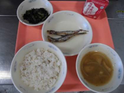 麦ごはん・牛乳・ししゃものからあげ・小松菜とひじきのいためもの・いものこ汁
