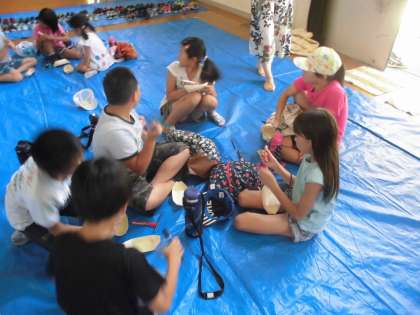 少年補導主催の野外活動が行われています。少年補導支部長と学校長のあいさつがあり,その後有栖川で遊ぶための舟に絵を描きました。これから,有栖川で川遊びをします。
