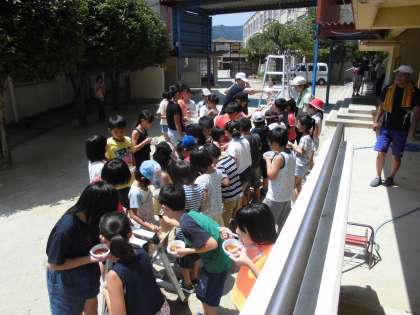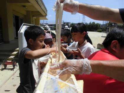 カレーを食べた後は,流しそうめんです。流れるそうめんを子どもたちは楽しんですくって食べていました。とっても涼しげです。