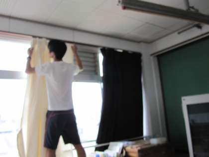 PTAの方々に洗っていただいたカーテンを教職員で,各教室に取り付けました。また,校内の教材整理を行いました。