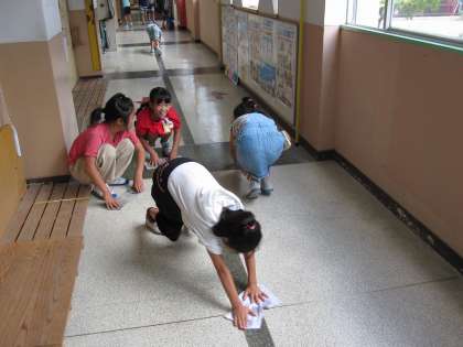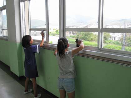 夏休みの間に汚れたところを全校で掃除をしました。職員室前の廊下を4年生が隅々まで,きっちりと掃除していました。