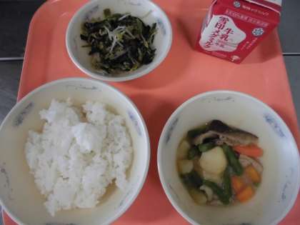 ごはん・牛乳・豚肉と野菜の煮つけ・ほうれん草ともやしのごま煮