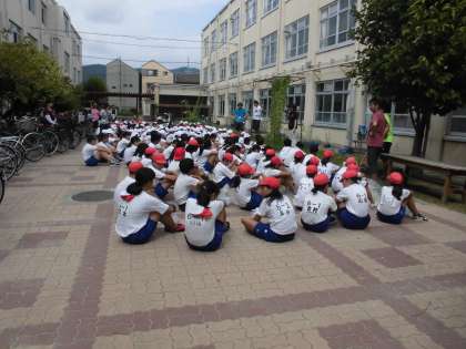 4〜6年生は、まず、中庭で校長先生からお話を聞いてから出発です。