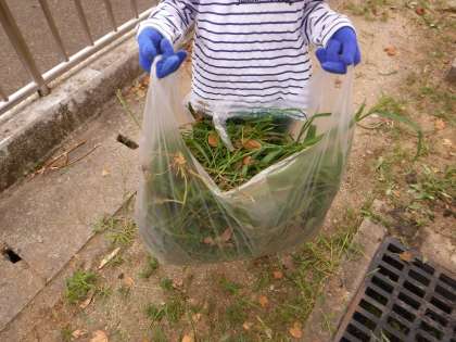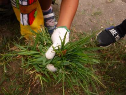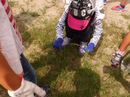 子どもたちはまず一番身近なところの草をひたすら引っ張っていたのですが,どうにも能率が上がりません。次第により長い草が生えているところや,日陰の湿った地面に移動して行きました。その方が草を引きやすいのです。
