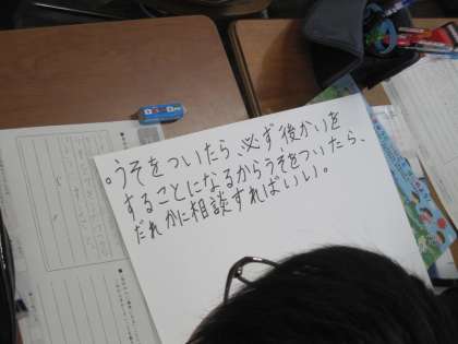 今日は,本校の道徳推進教師が,示範授業を行いました。校内研修で話題になった「共通解」を学習のめあてにするのではなく,「納得解」を作っていくことをめあてとしました。今日の学習のめあては,「自分の心に誠実になるよさはなんだろう」として,みんなで考えました。