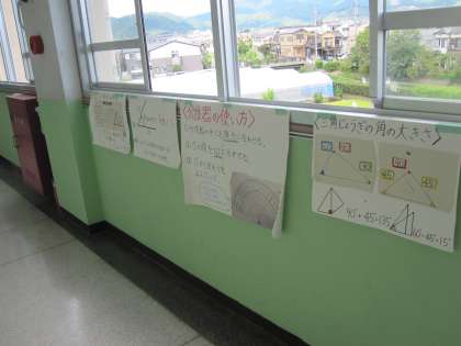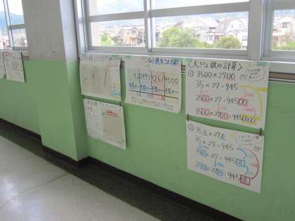 それぞれの学年の掲示板や教室前には,学習で用いた掲示物や算数に関わるクイズが貼り出されています。4年生教室前には,これまでの学習で用いた掲示物やそれぞれの単元のまとめが掲示されています。わりざんの筆算の仕方,大きな数の計算の仕方,分度器の使い方や三角定規の使い方などです。