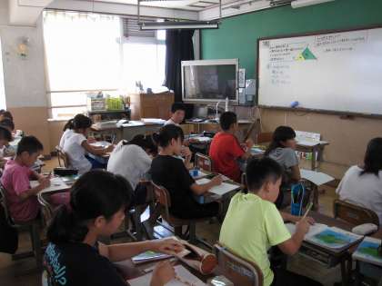 拡大図のかき方を学習しました。元の図形をもとにして,2倍になる拡大図を簡単に作図できる方法を学級で意見を出し合いました。