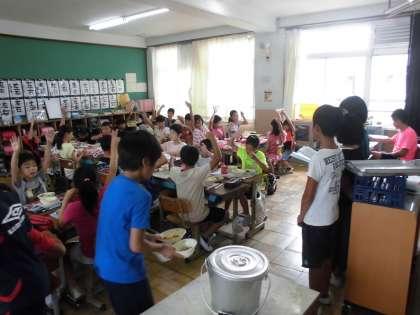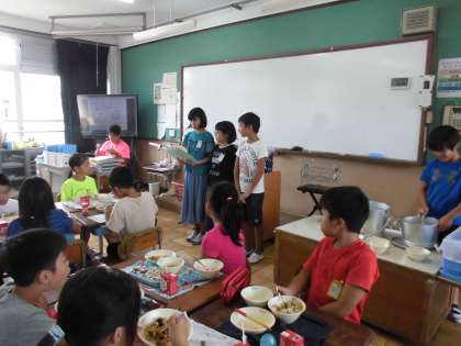 給食委員会から、給食のマナーについて楽しくふり返ってもらおうと、クイズを作って全クラスを回っています。
