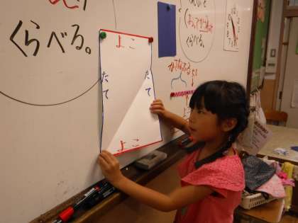 算数科では「大きさくらべ」の学習をしています。はがきを折って縦と横の長さを比べるのですが,1年生の子には,どの部分が重なっているのか分かりにくいようでしたので,前で色分けしながら演示してもらい,理解を深めようとしています。