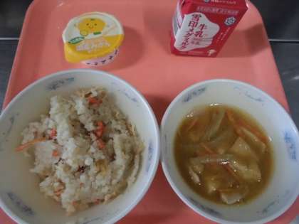 給食では、備蓄されていたアルファ化米とチキンささみ、たけのこ、乾燥にんじん、しいたけの具を加えて加熱し、炊き込みごはんにしました。