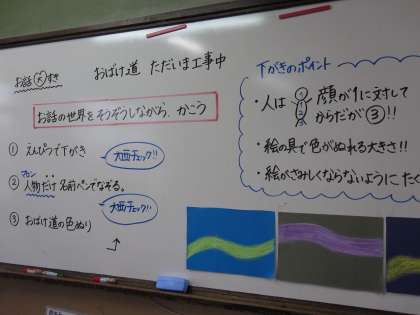 お話の絵を進めています。線描を大切にしながら,色を塗り始めている子どももいます。