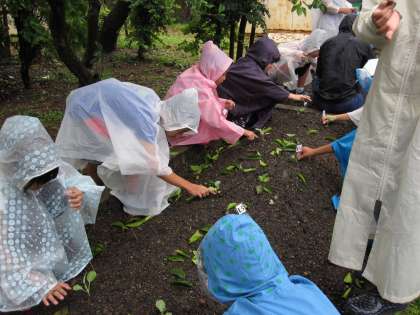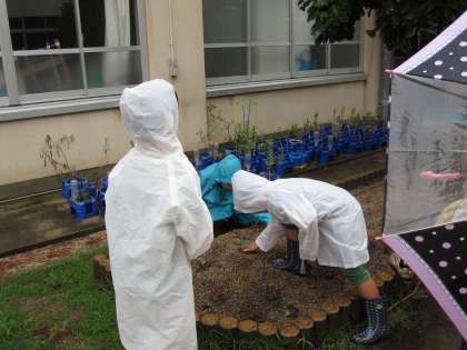 雨の中でしたが,畑に移動し,一人一人,自分のブロッコリーの苗を植えました。とても大きくなるということで,友達との間は30cm以上あけて,苗を植えつけました。大きく育つのがとても楽しみです。