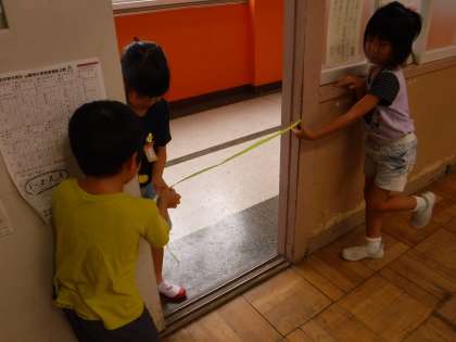 算数科「おおきさくらべ」では,直接比較を終えて間接比較の学習に入りました。テープを使ってケースが机に乗るか調べたり,台が扉を通るか測ったりしています。次は決まった長さのものがいくつ分(任意単位での比較)に入って行きます。段階を踏みながら長さやかさを比べていく学習をしています。