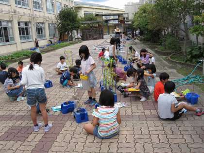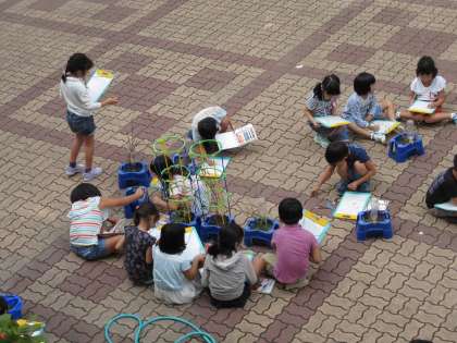 育ててきたトマトが実をつけ終わった後の様子を観察しました。茎が枯れて硬くなっている様子など,観察カードに絵と言葉でかいていました。
