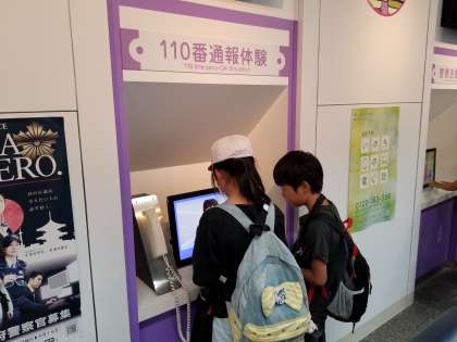 京都府警広報センターでの様子です。シミュレーション機器を使って110番通報体験をしたり,クイズに取り組んだりしました。白バイにもまたがってワクワクです。