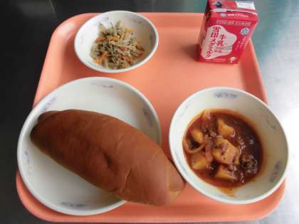 黒糖コッペパン・牛乳・牛肉のトマト煮こみ・ごぼうのソテー