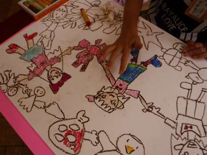 図画工作科では,「お話の絵(絵に表す)」に取り組んでいます。1年生はパスで画用紙に線描をし,丁寧に塗りこんでいく段階に入っています。とてもかわいらしい,一人一人それぞれの作品になるよう頑張って描いています。
