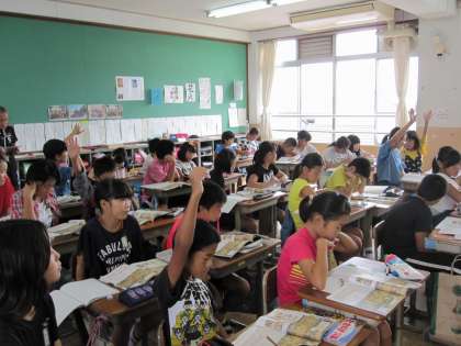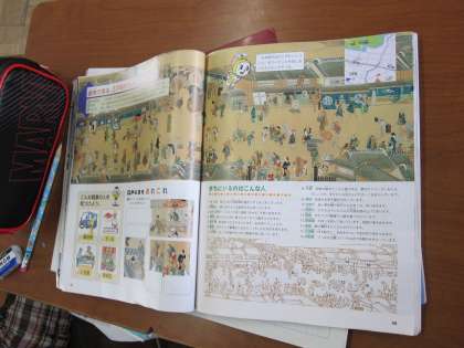 江戸時代の様子の絵を見て,今との違いについて考えました。水道がない,着物を着ているなどが子どもたちの意見から出てきました。
