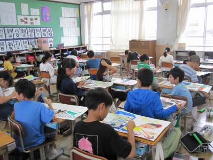 お話の絵の彩色をしています。慎重に筆を整えて,ていねいに塗り進めていました。