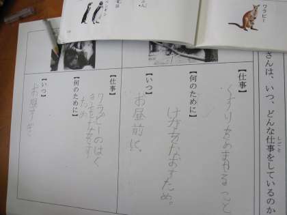 「どうぶつ園のじゅうい」を読んで,「しごと」「何のために」「いつ」の項目に分けて読み進めました。