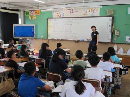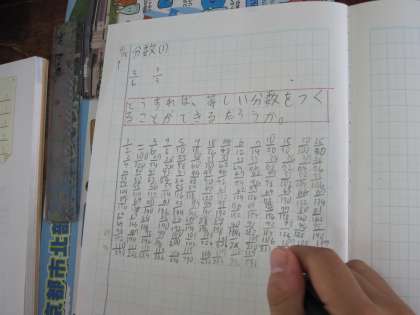 数直線上に分数を書くことで,等しい分数は何になるのかを考えました。また,どのようにすれば,等しい分数が作れるのかを考えました。1/2と等しい分数は,2/4,3/6,6/12など,たくさんあります。このことを考えることで,約数や通分などにつながっていきます。