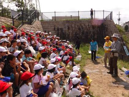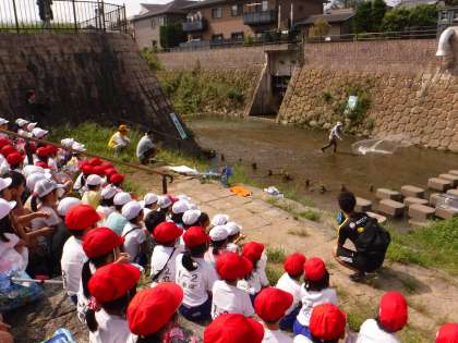 待ちに待った有栖川での「かわあそび」。まず,川の名人(自称「有栖川のカッパ」)中川さんに,『川のすごさ・たのしさ・こわさ』を教えていただきました。投網で魚を取る技も見せていただきました。
