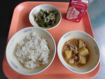 麦ごはん・牛乳・肉じゃが(ピリカラみそ味)・千切大根の煮つけ