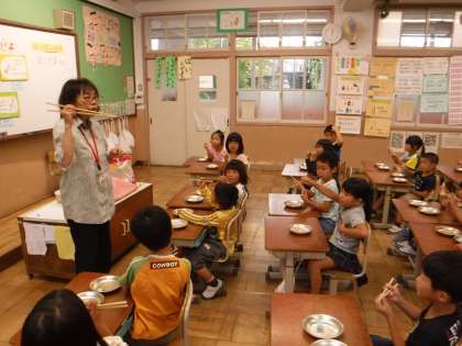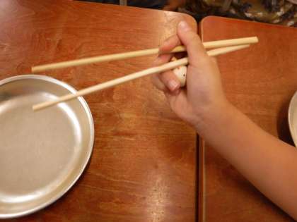 と紹介され,なにやら感心深げに聞いていた1年生。いよいよお箸を持つようになるともう大騒ぎです。