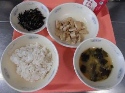 麦ごはん・牛乳・きつね丼(具)・小松菜とひじきのいためもの・みそ汁